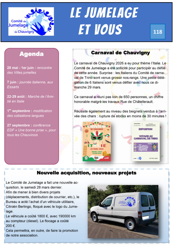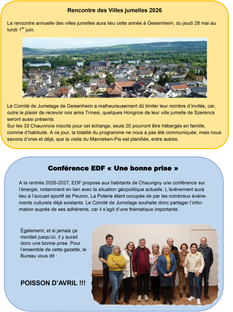 « Le comité de jumelage de Chauvigny est une belle aventure humaine, fondée sur des valeurs de partage, d’échange et de coopération. Nos liens avec Trino, Geisenheim, Billericay et Banfora ont su traverser les décennies et s’adapter aux évolutions de nos sociétés. Aujourd’hui, notre mission est double : préserver cet héritage d’amitié et de solidarité, tout en lui donnant un nouveau souffle. Ensemble, nous continuerons à tisser ces liens précieux entre nos villes et leurs citoyens. »